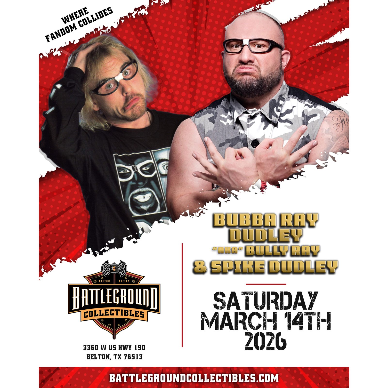 The legendary BUBBA RAY DUDLEY – also known as BULLY RAY – is crashing into Battleground Collectibles in Belton, Texas for an unforgettable meet & greet! Joining him will be the one and only SPIKE DUDLEY!